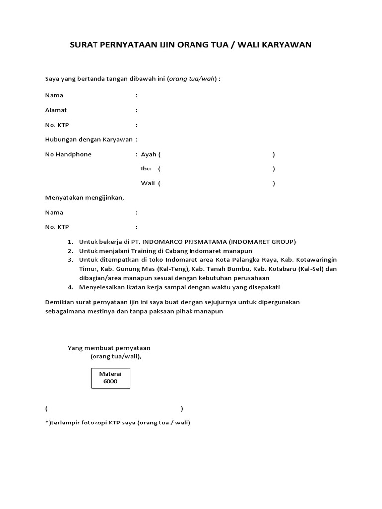 Surat Pernyataan Izin Orang Tua Wali Suami from cdn.slidesharecdn.com Menulis surat izin dari orang tua tidaklah begitu susah dan mungkin sudah merupakan hal yang biasa bagi sebagian orang. Tanda tangan jangan lupa untuk mencantumkan nama terang dan membubuhkan tanda. Contoh surat izin / contoh surat persetujuan orang tua untuk mendaftar tni. Terkadang perusahaan memang menginginkan para karyawannya untuk bisa bekerja di luar kota ataupun ditempatkan untuk waktu tertentu di kota lain. Tidak semua orang tahu mengenai surat keterangan. Dimas imam prayoga tempat, tanggal lahir : Surat keterangan kerja ini digunakan untuk pengambilan asuransi, kredit. Untuk menghindari masalah hukum, pihak pemberi kerja biasanya mewajibkan lampiran berupa surat pernyataan kerja dari orang tua yang menyatakan bahwa orang tua telah memberikan izin pada anaknya untuk bekerja di perusahaan terkait.