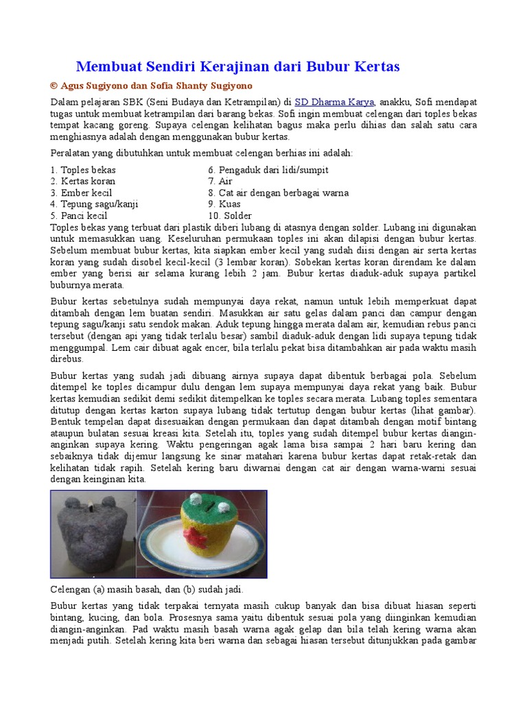 Gambar mewarnai juga dapat meningkatkan kemampuan motorik anak sehingga lebih dapat bahkan belajar mewarnai juga bisa menggunakan beberapa tokoh kartun favorit si kecil seperti di dunia ini terdapat berbagai macam jenis bunga dari berbagai wilayah yang memiliki keindahan. Topeng dari kertas karton bubur siap digunakan. Kertas, pembuatan bubur kertas, pencampuran dengan lem dan pewarna, pencetakan. Meskipun mirip, proses pembuatan kompos yang umumnya menggunakan sampah biomassa yang bisa didegradasi oleh alam, tidak dikategorikan sebagai proses daur ulang. Media ini juga berpengaruh pada pemilihan media pewarna untuk menambah pemahamanmu tentang organ gerak manusia yang berupa tulang, buatlah model sederhana rangka manusia dari bahan bubur kertas. Lekatkan hingga membentuk figur yang diinginkan. Nah, dari pada berserakan dan hanaya membuat ruangan menjadi berantakan dan tidak rapai, alangkah baiknya kita jadikan sebagai kerajinan. Cara membuat patung dari bubur kertas / angry bird bubur kertas. Pewarnaan yang hanya menggunakan pewarna tunggal. Material yang bisa didaur ulang terdiri dari sampah kaca, plastik, kertas, logam, tekstil, dan barang elektronik. Ragam karya ilmiah pun banyak, mulai dari tentang kebahasaan, kesehatan bahkan hingga pendidikan. Kerajinan tangan dari bubur kertas merupakan salah satu contoh kerajinan yang dapat anda praktikkan sendiri di rumah. Bahan yang biasa digunakan antaralain semen, tanah liat, gips, bubur kertas, dan lain sebagainya.