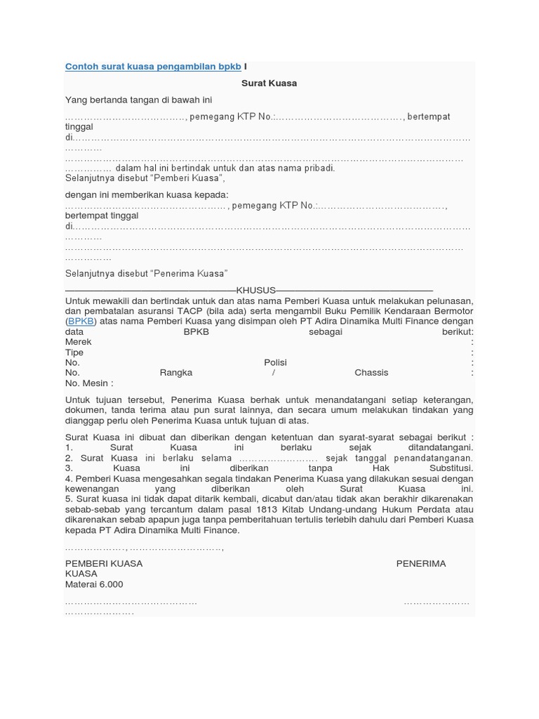 Contoh Surat Kuasa Pengambilan Bpkb Adira Finance / Contoh Surat Kuasa Pengambilan Bpkb Acc Contoh Lif Co Id / Contoh surat kuasa pengambilan bpkb motor milik perusahaan.. Contoh surat kuasa pengambilan bpkb motor milik perusahaan. Tanggapan adira finance atas surat bapak wahmub abdurachman. Sehubungan dengan keluhan yang dimuat pada website mediakonsumen.com. Jika hal ini terjadi, pemilik kendaraan harus menuliskan surat kuasa agar dokumen bpkb dapat diambil dan tidak disalahgunakan oleh orang lain. Surat kuasa pengambilan bpkb adalah dokumen yang sangat diperlukan sebagai syarat sah pemindahan kekuasaan atau wewenang untuk pengambilan dokumen bpkb.